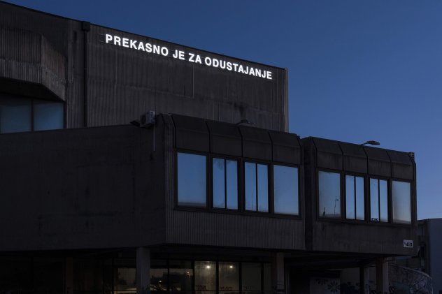 Umjetnička intervencija koju čini svjetlosni natpis od četiri riječi Prekasno je za odustajanje poziva na ustrajnosti, unosi rubni optimizam i nadu u vremenski procjep i prostorni kontekst upisujući se istovremeno u osobno i društveno, specifično i opće. Porozna na vremenski i prostorni kontekst, sintagma odjekuje na nepredvidive načine u javnom prostoru.
