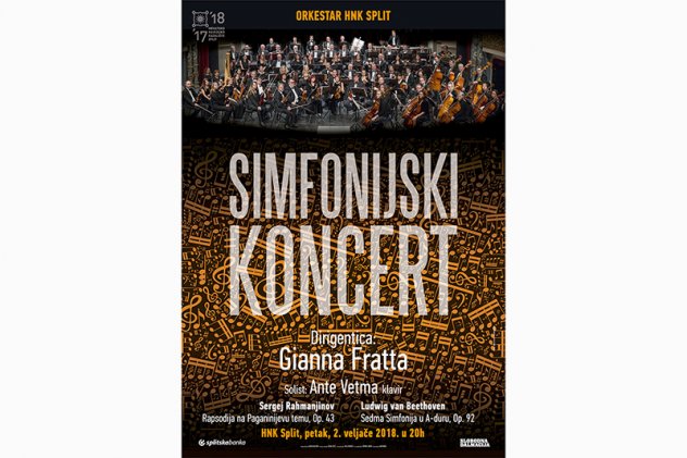 Orkestar Hrvatskog narodnog kazališta Split održat će svoj drugi simfonijski koncertom u ovoj sezoni. Izvedbom će ravnati maestra Gianna Fratta, talijanska dirigentica zavidne međunarodne karijere, a kao solist nastupit će nagrađivani mladi splitski pijanist Ante Vetma. Na programu su dva glazbena remek-djela koja spadaju u sam vrh simfonijskog repertoara, Rapsodija na Paganinijevu temu, op. 43 Sergeja Rahmanjinova i Sedma Simfonija u A-duru, op. 92 Ludwiga van Beethovena. Koncert se održava u velikoj dvorani HNK Split u petak 2. veljače s početkom u 20 sati.