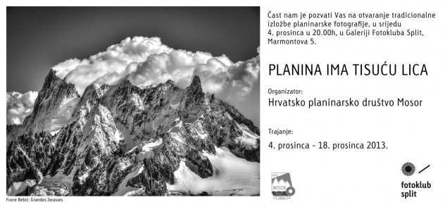 Plaina ima tisuću lica naziv je sad već tradicionalne izložbe fotografija na temu planinarstva, alpinizma, te planinske flore i faune koju u galeriji Fotokluba Split organizira HPD Mosor. Izložbe se otvara večeras, u srijedu 4. prosinca, i potrajat će do 18. prosinca, a obuhvatit će 44 fotografije, rad 22 autora. One su probrane među ogromnom količinom od oko 1200 fotografija koje su pristigle na Mosorov natječaj, od 83 autora iz Hrvatske, Crne Gore, Srbije i Bosne i Hercegovine. Selekciju su napravili Andrea Musa i Nenad Šaljić.