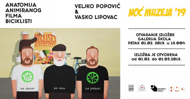 Brojna zainteresirana javnost će u petak, 1.2.2019. u Galeriji Škola u Splitu moći premijerno pogledati višestruko međunarodno nagrađivan animirani film splitskog autora Veljka Popovića „Biciklisti“, te dosad javnosti ne izlagane radove velikog splitskog umjetnika Vaska Lipovca koji su svojim mediteranskim šarmom i erotskom provokacijom nadahnuli samo stvaranje i vizualni prosede filma.