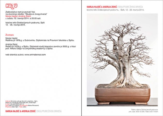 U subotu 12. travnja u 20 h u Diklecijanovim podrumima otvara se izložba živih skulptura drveća – bonsaija. Ovo je zajednička izložba Marije Hajdić i Andrije Zokića, para iz Kaštela koji ima preko 200 bonsaija.