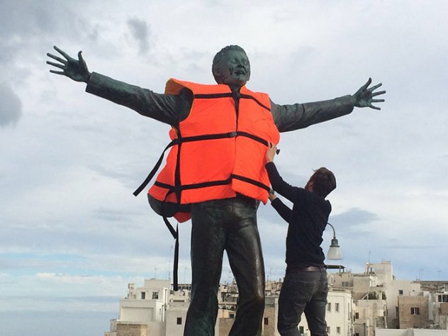 Malo dalje, neprirodno uvećani objekt u obliku prsluka za spašavanje, još jedan simbol, umjesto da iskazuje svoju primarnu funkciju, ispunjava prostor i uvlači ga u sebe, golem je i neprikladan, gotovo zagušuje. Ironija, kao i mnoge s kojima se svakodnevno susrećemo - smiješna, ali zaprava nimalo smješna - naglašena je performativnim činom oblačenja kipa Domenica Modugna u talijanskom gradiću Polignano a Mare. Na stolu, imaginarna putovnica, alegorija jednako tako imaginarnog putovanja iz Prištine u Švicarsku, obećanu zemlju. Pravno obvezujući dokument za “nesigurna stanja postojanja”, koju prati serija crteža koja se premijerno prikazuje upravo u Salonu Galić. U potpunosti novi rad produciran za ovu izložbu zastava je s jednostavnom sintagmom koja označava mjesto održavanja izložbe kao povijesno bogati prostor preopterećen masovnim turizmom, što je neizravna referenca na Selmanijevo zanimanje za baštinu, povijest i kulturne promjene, kao i njegovo iskustvo Splita posljednjih godina (2020. je boravio na rezidenciji te je radio intervencije za Almissu Open Art 2020. i Praznine 2022.). Poruka je i jasna i dvosmislena: blago vama (Lucky you). Zastave u Dritonovoj praksi imaju posebno mjesto: one su savršeni, ma koliko labavi simbol konstruiranog identiteta, pružajući tako mnoštvo mogućnosti za manipulaciju.