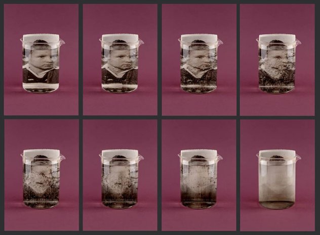 Specifičnost fotografije kao medija ističe se u njenoj proturječnosti. Fotografijama nastojimo uhvatiti trenutke i ovjekovječiti ih kako ne bi iščeznuli iz sjećanja, dok s druge strane one upravo ukazuju na prolaznost vremena i krhkost sjećanja. Gundić prizorima topljenja lica i silueta vjerno prikazuje fragilnost ljudskog pamćenja i težnju da ga sačuva. Neumoran protok vremena i nestalnost u ovom radu problematiziran je na dvije razine, sadržajnoj i materijalnoj. Sadržajno, fotografije prikazuju minulo obiteljsko vrijeme – slavlja, rođendane, vjenčanja – kojih autor nije bio dio. Materijalno, već pomalo narušeni i raspadljivi papirnati objekti dodatno se podvrgavaju procesima uništenja. Niz izloženih fotografija bilježi dematerijalizaciju, odnosno raspadanje obiteljskog arhiva nižući ih u sekvencama kako bi se dao naglasak na dugotrajnosti procesa. Suprotno tome, videozapis teče ubrzano, čiji plošan prikaz demonstrira raspad fotografija u mjehuriće, komadiće i talog. Uvođenjem laboratorijskog pristupa u okviru umjetničkog procesa razlikujemo dva pristupa u istraživanju fotografija. Objektivan i hladan znanstveni pristup koji je vođen ustaljenom metodologijom, Gundić suprotstavlja umjetničkom istraživanju lišenom strogosti metodološkog pristupa. Umjetnik je uz pomoć stručnjaka Mediteranskog instituta za istraživanje života proveo kemijsku analizu sastava fotografija kojom je ustanovljena približna masa srebra u fotosenzibilnom sloju fotopapira, a time i broj od 86 fotografija potreban za izradu opipljivog komada srebra. Iako se proces nastanka radova odvijao u laboratoriju, autorovo umjetničko istraživanje osobne je prirode jer su u fokusu pitanja obiteljskog nasljeđa i uspomena. Objektivno, vrijednost otopljenih obiteljskih uspomena u srebru iznosi 490 mg, što je približna vrijednost kovanice od 5 kuna. Međutim, subjektivna komponenta uništenog obiteljskog arhiva ima i memorijsku vrijednost, i to mnogo veću od one monetarne, zbog čega se autor odlučio za njeno izlaganje ispod staklenog zvona.