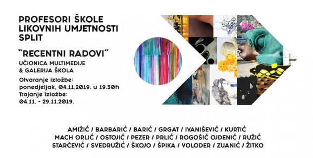 U Galeriji Škola na adresi Fausta Vrančića 15, u ponedjeljak 4.11.2019., s početkom u 19.30 sati, otvara izložba „Recentni radovi" profesora Škole likovnih umjetnosti Split. Javnosti će se predstaviti devetnaest radova renomiranih umjetnika, profesora stručnih predmeta škole.