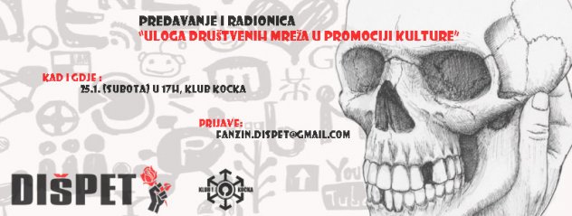 Fanzin Dišpet organizira u klubu Kocka u subotu, 25. siječnja u 17 sati radionicu Uloga društvenih mreža u promociji kulture, smatrajući tu temu jednom od najaktualnijih u suvremenom kulturnom menadžmentu. Naime, jedan od načina za korištenje moći i potencijala jest i unapređivanje vlastitog obrazovanja.