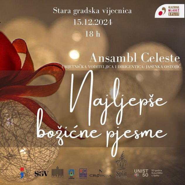 Ansambl Celeste donosi koncert "Najljepše božićne pjesme" u Split, 15.12.2024. od 18 h u Staroj gradskoj vijećnici. Ansambl Celeste okuplja pjevače i svirače različitih profila. Božićni program izvest će u sastavu: Marta Brkljačić, sopran, Rea Veseli, sopran, Ines Grubišić, alt, Lovre Gujinović, tenor, Fabijan Komljenović, bariton i Jure Černeha, klavir.Na programu se nalaze najljepše i najpoznatije hrvatske i internacionalne božićne pjesme. Koncert se izvodi u suradnji Glazbene mladeži Split, Muzeja grada Splita, Sveučilišta u Splitu, uz potporu Turističke zajednice grada Splita, Ministarstva kulture i medija RH te grada Zagreba.