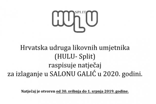 Hrvatska udruga likovnih umjetnika (HULU-Split) raspisuje natječaj za izlaganje u Salonu Galić u 2020. godini. Natječaj je otvoren od 30. svibnja do 1. srpnja 2019. godine.