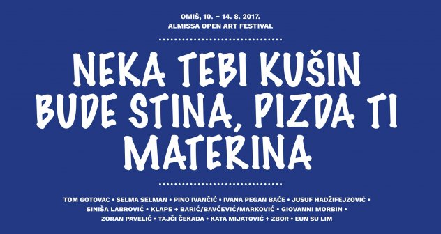 Naziv ovogodišnjeg programa Almissa Open Arta "Neka tebi kušin bude stina pizda ti materina" poziv je lokalnim stanovnicima i turistima kao privremenim građanima Omiša na kolektivnu akciju građanskog neposluha, na otvoreno i glasno negodovanje, pa čak i beštimu! Umjetnici i njihovi radovi samo su okidač tog neposluha i zajedničkog krika pobune i nepristajanja.