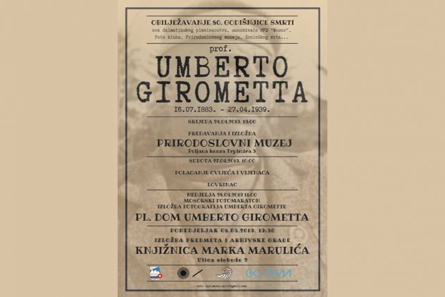 HPD Mosor, Prirodoslovni muzej Split, Gradska knjižnica Marka Marulića i Fotoklub Split organiziraju prigodni program obilježavanja 80. godišnjice smrti prof. Umberta Giromette (27.4.1939.).