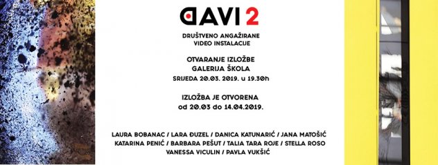 Na izložbi Društveno angažiranih video instalacija DAVI 2, četiri video instalacije i jednu prostornu izlažu učenice odjela Fotografski dizajner: Laura Bobanac, Lara Đuzel, Danica Katunarić, Jana Matošić, Katarina Penić, Barbara Pešut, Talia Tara Roje, Stella Roso, Vanessa Viculin i Pavla Vukšić u vodstvu mentora profesora Hrvoja Zuanića.