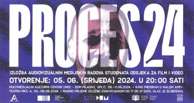 Godišnja izložba audiovizualnih medijskih radova „Proces 24“ predstavlja radove studenata_ica preddiplomskog i diplomskog studija Odsjeka za film i video Umjetničke akademije u Splitu (UMAS), nastale u sklopu nastave akademske godine 2023/2024. u okviru kolegija koje predaju prof. art. Toni Meštrović, prof. art. Sandra Sterle i doc. art. Đildo Bavčević.