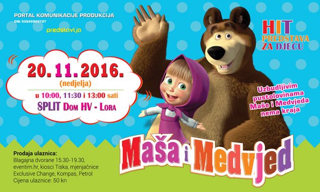 Maša i Medvjed omiljeni su animirani likovi iz istoimenog crtanog filma koje su mnoga djece jako zavoljela, a sada svoje junake mogu pogledati i uživo, u obliku predstave u nedjelju, 20.11. u 10.00, 11.30 i 13.00 u Domu HV – Lora.