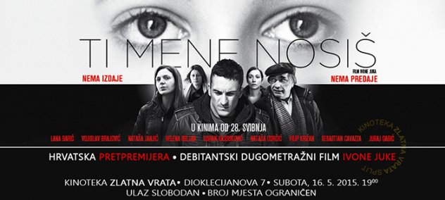 U Kinoteci Zlatna vrata u subotu 16.5.2015. u 19:00 sati će se održati HRVATSKA PREMIJERA filma TI MENE NOSIŠ Ivone Juka, a ulaz je slobodan.