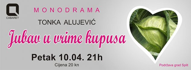 U petak 10.4.2015., svi ste pozvani na novo izdanje Quasi Cabareta, monodramu „Jubav u vrime kupusa“ splitske spisateljice, avanturistice, televizijske urednice i voditeljice Tonke Alujević.