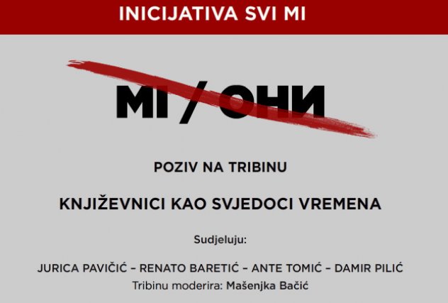 Inicijativa SVI MI - Za Hrvatsku poziva Vas na tribinu ''Književnici kao svjedoci vremena'' koja će se održati u Splitu, u ponedjeljak, 1. lipnja 2015., s početkom u 18 sati, u prostoru Gradske knjižnice Marka Marulića, Ulica slobode 2.
