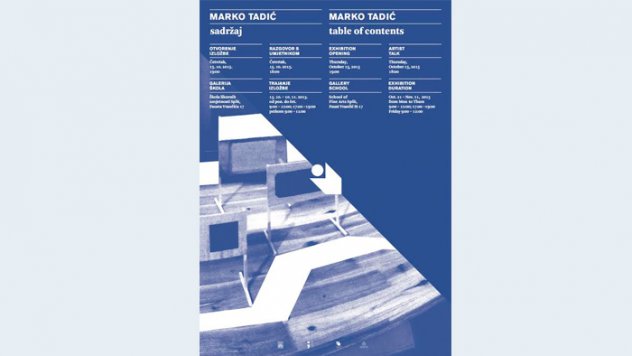 Nova izložbena sezona splitske Galerije ŠKOLA započinje u četvrtak 15.10. 2015. u 19 sati izložbom Marka Tadića ( u18:00 sati je razgovor s umjetnikom), ujedno predstavljajući i njegov najnoviji autorski ciklus. Table of Contents, autorovim prepoznatljivim vizualnim jezicima kroz ovu izložbu sadržajno propituje izložbu kao takvu, bitnu okosnicu umjetničkih transformacija XX. stoljeća, koja u ovih zadnjih par godina proživljava brojne transformacije i zadobiva nove komunikacijske kanale. Izmjestajući izložbeni kontekst i pojmovni aparat, Table of Contents uvodi nas u novi Tadićev privremeni postav, uz crtež kao osnovno pismo, a kolažiranje i apropriaciju bazne stvaralačke metodologije.
