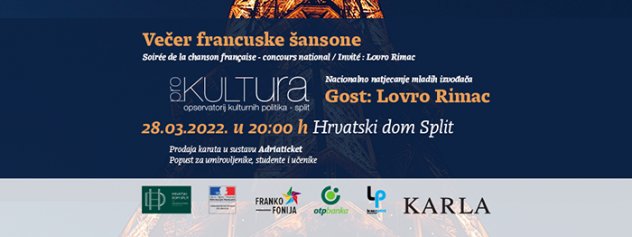 Prokultura organizira ovogodišnju Večer francuske šansone - nacionalno natjecanje mladih izvođača, a gost večeri je Lovro Rimac. Koncert se održava u ponedjeljak, 28. ožujka 2022. u 20 sati u Hrvatskom domu u Splitu.