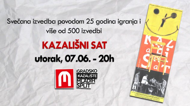 U sklopu završne retrospektive, Gradsko kazalište mladih večeras publici poklanja svečanu izvedbu predstave “Kazališni sat”, najdugovječnije splitske predstave koja neprekidno igra već nevjerojatnih 25 godina i koja je ove sezone izvedena čak petstoti put.