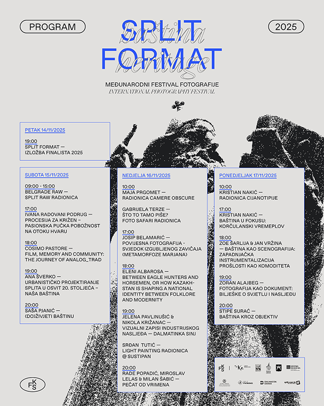 Večeras u 19 sati u Galeriji fotografije splitskog Fotokluba otvara se izložba finalista/kinja ovogodišnjeg izdanja festivala fotografije Split Format. U središte petog izdanja jest baština, a pritom navedena tema pritom nije bila samo okosnica raspisanog međunarodnog fotografskog natječaja i izložbe finalista/kinja, već je i zadani okvir cjelokupnog festivalskog programa koji traje cijeli produženi vikend. Očekuje nas jako puno toga – od radionica i predavanja pa do edukativnih foto-safari šetnji i razgovora s autorima. Naglasak je, kako ističu u Fotoklubu, na različitim perspektivama i novim mogućnostima promišljanja i aktualiziranja pojma baštine.