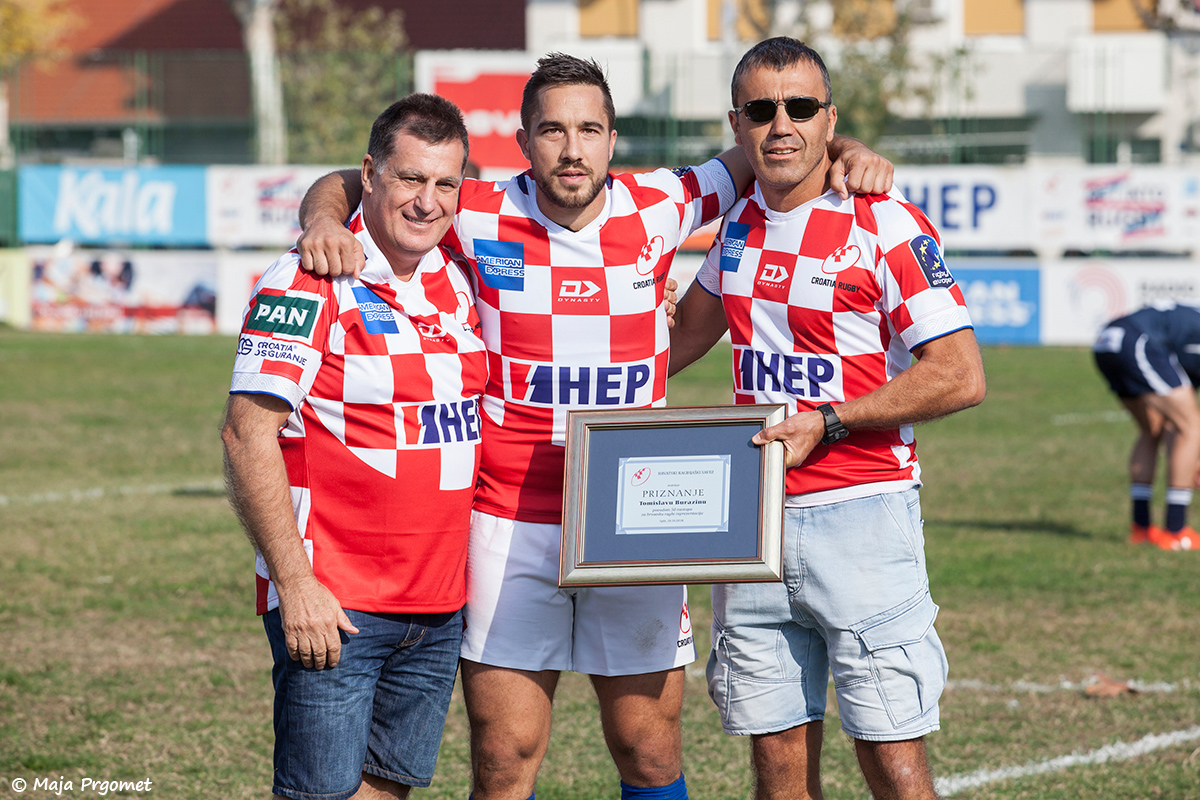 Tomislav Burazin na ovom je susretu upisao svoj 50. nastup za hrvatsku reprezentaciju, a prigodnu zahvalnicu mu je prije početka utakmice predala legenda hrvatskog ragbija, Nadin Denis Puljiz.