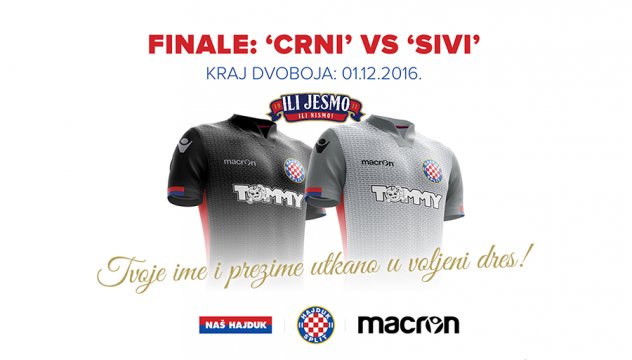 Projekt Ili jesmo ili nismo! ulazi u završna 2dana. Svi donatori iznosa od 1911 kn dobivaju priliku i glasovati za dizajn Hajdukovog dresa s njihovim imenima. Nakon 1. krug glasovanja u finalni dvobj su ušli 'Crni' vs. 'Sivi' dres. To znači da je bijela varijanta dresa sa zlatnim slovima otpala iz natjecanja. Još nije kasno da se uključite u projekt i dobijete svoje ime i prezime na Hajdukovom dresu, a ujedno i mogućnost glasovanja.