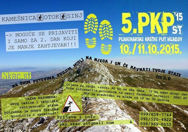 Organizator je Studentski katolički centar Split (Skac_St) i poziva sve mlade da im se u terminu 10. i 11.10.2015. pridruže na trasi KAMEŠNICA →OTOK → SINJ.