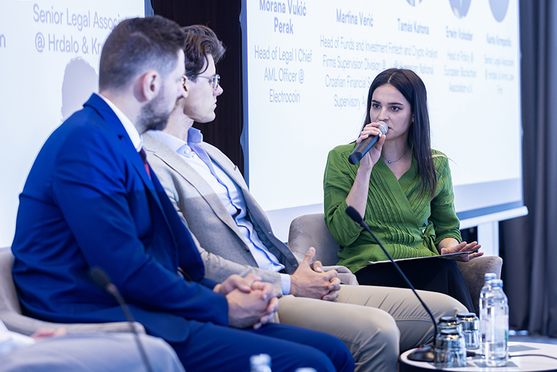 Uslijedila je panel diskusija o regulaciji tržišta kriptovaluta u EU na kojoj su se, pod moderatorskom palicom Karle Krmpotić iz odvjetničkog društva Hrdalo & Krnić, pridružili Morana Vukić-Perak, voditeljica pravnih poslova i odjela za sprječavanje pranja novca u Electrocoinu; Martina Verić iz Hrvatske agencije za nadzor financijskih usluga (Hanfa); Tamás Katona iz Narodne banke Mađarske te Erwin Voloder iz Europske blockchain udruge (EBA).