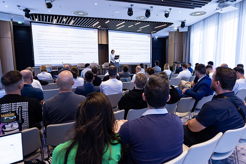 Rasprava se usredotočila na Uredbu o tržištima kriptoimovine, odnosno MiCA-u, koja će se početi primjenjivati 30. lipnja 2024. za izdavatelje tokena, a do kraja godine u punom opsegu i za ostatak regulative. MiCA će regulirati CASP-ove i izdavatelje tokena, što je dodatno objasnila Martina Verić. Panelisti su raspravljali o svojim nacionalnim jurisdikcijama i implementaciji MiCA-e, napominjući kako će u Mađarskoj nadležno tijelo biti Narodna banka Mađarske, za razliku od podijeljenog nadzora u Hrvatskoj između Hrvatske agencije za nadzor financijskih usluga (Hanfa) i Hrvatske narodne banke (HNB). Vukić-Perak je napomenula kako je Hrvatska još prošle godine izmjenama Zakona o sprječavanju pranja novca i financiranja terorizma, napredovala po pitanju pripreme za MiCA-u. Također je istaknula i izazove s kojima se suočavaju registrirani CASP-ovi u Hrvatskoj te kako će postojeća registracija CASP-ova pomoći u usklađivanju s MiCA-om, no i dalje postoje razlozi za brigu u vidu vremenskog okvira za implementaciju Uredbe i mogućih regulatornih nejasnoća.