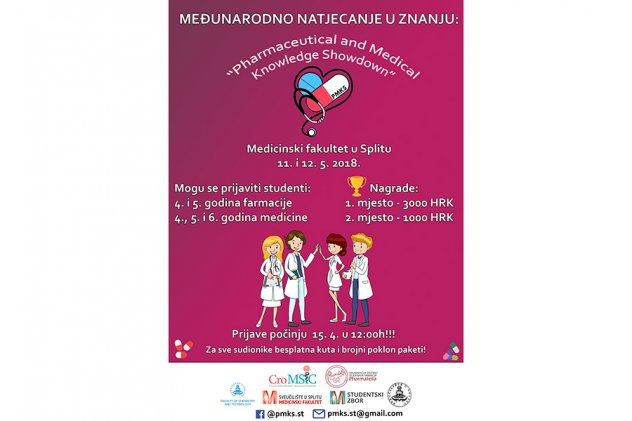 „Pharmaceutical and Medical Knowledge Showdown“-PMKS je međunarodno natjecanje u znanju u kojem sudjeluju studenti završnih godina studija farmacije i medicine. Sastoji se od ukupno 32 natjecatelja koji dolaze s čak osam različitih fakulteta iz 5 različitih sveučilišnih gradova: Mostar, Sarajevo, Novi Sad, Zagreb i Split. Dosadašnja natjecanja u znanju na području biomedicine i zdravstva u Splitu su imala lokalni karakter što smo odlučili promijeniti. Još važnije, potpuni zaokret odlučili smo napraviti glede zadataka i izazova s kojima se susreću natjecatelji. Naime, natjecanje se sastoji od 3 zadatka te je samo prvi zadatak isključivo pismenog tipa dok se sljedeća dva zadatka potpuno temelje na praktičnom radu. Sudjeluje 8 timova koji se kroz zadatke profiliraju, ispadaju oni koji budu najlošiji, a najbolji tim na kraju osvaja glavnu nagradu u iznosu od 3000 kn. Natjecanje će se održati 11.i 12.svibnja 2018. na Medicinskom fakultetu u Splitu.