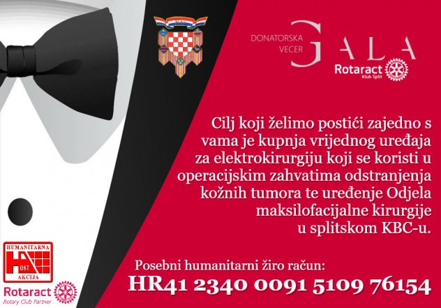 - „Upravo u tom duhu, služenja i pomaganja onima koji su u potrebi, po prvi put organiziramo ovakvu vrstu događaja s ciljem kupnje vrijednog uređaja za elektrokirurgiju, koji se koristi u operacijskim zahvatima odstranjenja kožnih tumora te uređenja Odjela za maksilofacijalnu kirurgiju u splitskom KBC-u. Želja nam je pokazati da mladi mogu biti i jesu nositelji svjetla u našem društvu, te da će oni, prvenstveno svojim vlastitim doprinosom, ostaviti nešto vrijedno za svoju lokalnu zajednicu!“ – poručili su iz Rotaract kluba Split.