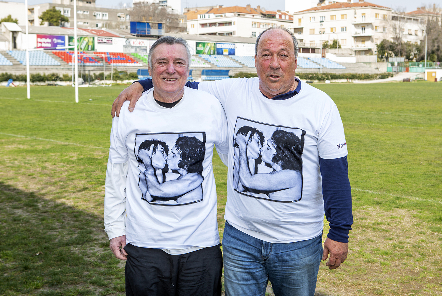Emocije su zajebana stvar - rekao je pokojni Ivica Hlevnjak Bukle, legendarna hajdukovac. Generacija sa našim Draženom Mužinićem Frfom i Vilsonom Džonijem. I jesu, zajebane su. Naročito prema Hajduku koji od igrača čini doživotne prijatelje, a od navijača – familiju! Legendarnu sliku Frfe i Džonija snimio je Jadran Lazić, a hajdučke legende i danas je ne mogu pogledati a da ne 'umru od smija'. Mo'š mislit kako će im biti kada se vide na majici! Sve je to život – šaka suza, vrića smija!