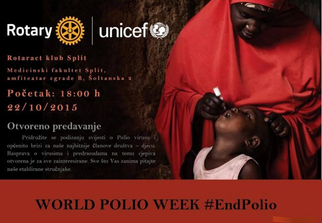 Rotaract klub Split organizira otvoreno predavanje o poliovirusu, naporima Rotary Internationala u iskorjenjivanju istog te kontroverzama oko cijepljenja u četvrtak, 22. listopada, u amfiteatru zgrade B Medicinskog fakulteta ( nova zgrada ) s početkom u 18 sati.