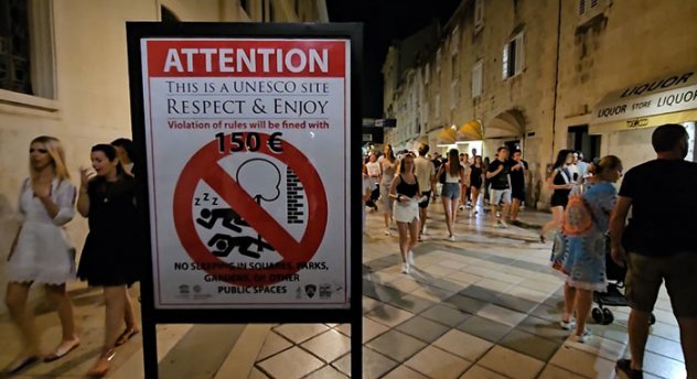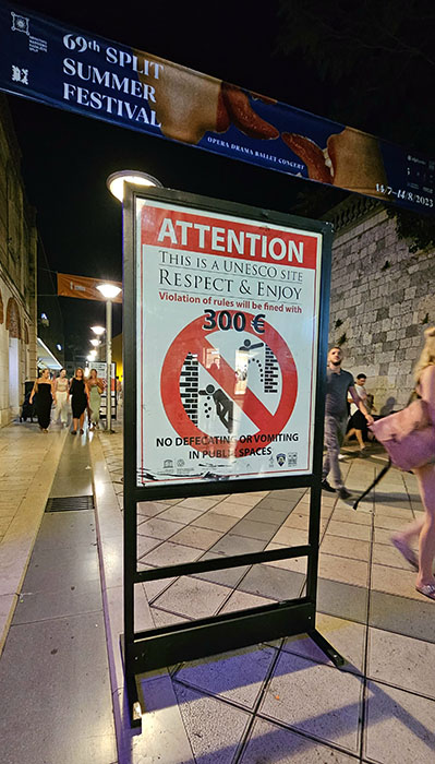 Ovo ljeto veliki problem su postali pijani mladi turisti koji svakodnevno remete javni red i mir pa je Grad Split na najfrekventnijim mjestima u staroj gradskoj jezgri postavio ploče i plakate na kojima se posjetitelje informira o pravilima ponašanja u našem gradu. Ukoliko prekršite neko pravilo cijena kazne može se popeti i do 300 eura.