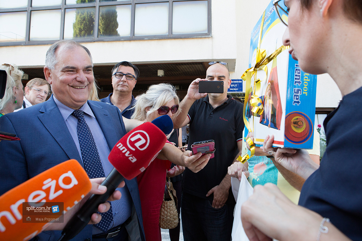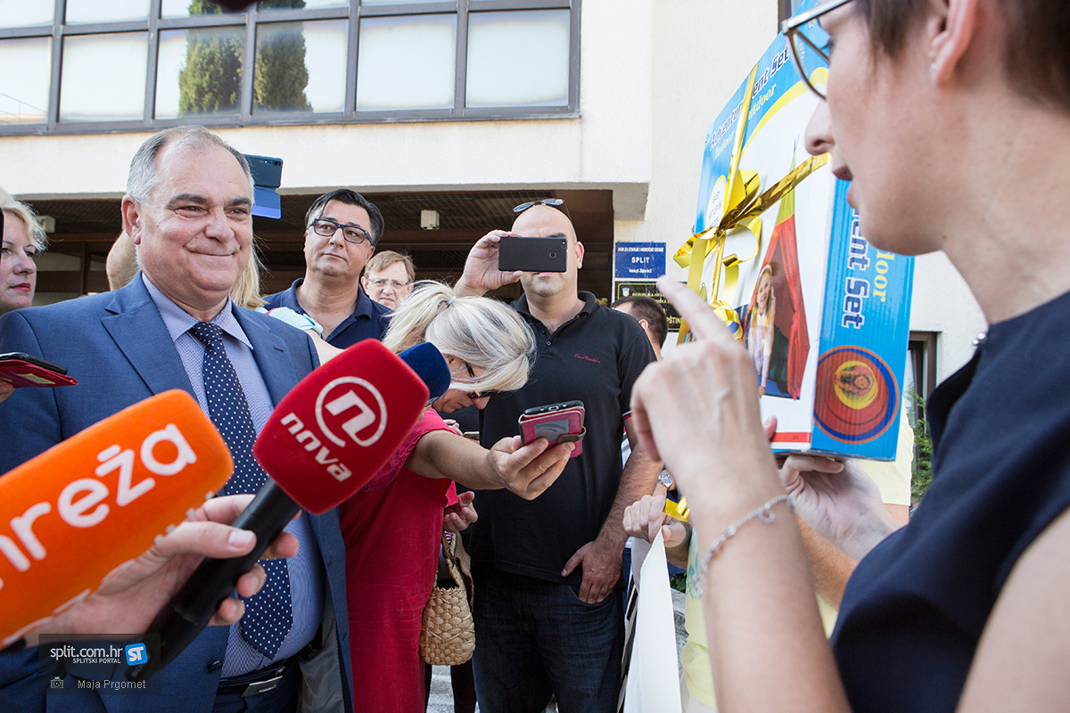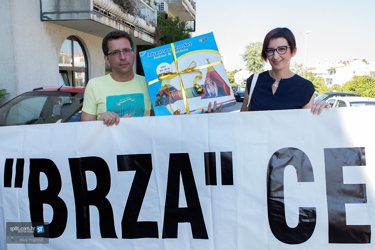 Vijećnici stranke Pametno i Građanska inicijativa za Brzu cestu Trogir - Omiš okupili su se jutros pred staračkim domom na Zenti u kojem se održava sjednica Županijske skupštine u Splitu, te su županu Blaženku Bobanu poklonili šator.