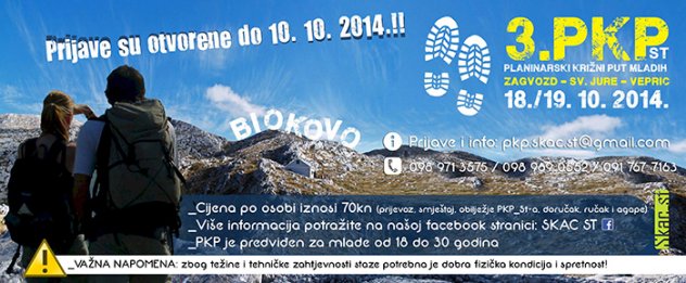 Studentski katolički centar Split organizira "Planinarski križni put 2014." (PKP_St) koji će se održati na trasi Zagvozd-Sv.Jure-Makarska u terminu 18.-19.10.2014.