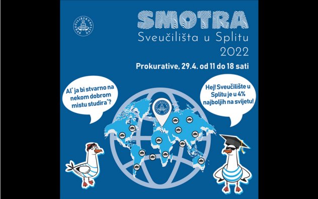Smotra Sveučilišta u Splitu održat će se 29. travnja od 11 do 18 sati na Prokurativama. Svi fakulteti Sveučilišta u Splitu, Akademija, odjeli, samostalni studiji, Sveučilišna knjižnica, Studentski centar, Studenski zbor predstavit će budućim studentima i svima zainteresiranima svoje studijske programe, uvjete upisa, smještaj, prehranu kao i sve ostale usluge.