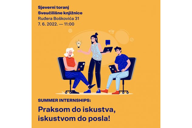 Događaj pod nazivom “SUMMER INTERNSHIPS: Praksom do iskustva, iskustvom do posla!” održat će se sutra (utorak 7.6.) s početkom u 11 sati u multimedijalnoj dvorani Sjevernog tornja Sveučilišne knjižnice (Ruđera Boškovića 31).