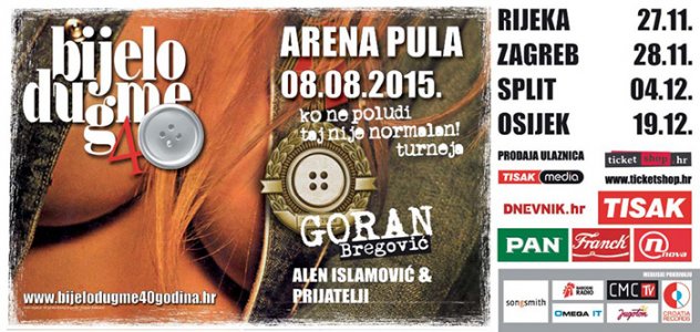 Jedna od najpoznatijih grupa s ovih prostora, Bijelo dugme, ove godine slavi 40 godina karijere i to na najbolji mogući način; velikom koncertnom turnejom osnivača i autora pjesama Bijelog Dugmeta Gorana Bregovića, zajedno s zadnjim pjevačem Bijelog dugmeta Alenom Islamovićem , njihovim Orkestrom i gostujućim prijateljima iznenađenja, koja će započeti ovog kolovoza u pulskoj Areni!