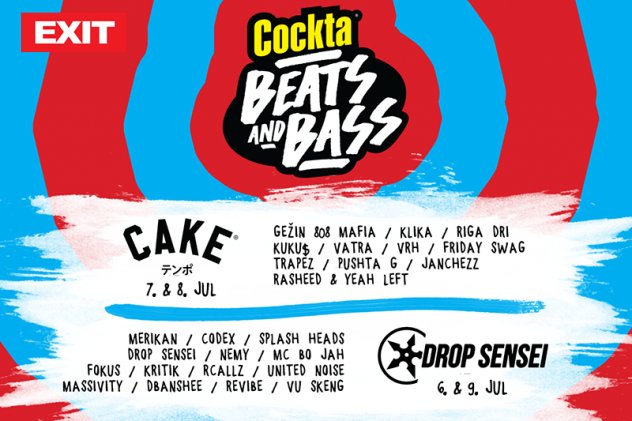 Drop Sensei zaduženi su za program dva dana na novoj Cockta Beats&Bass sceni, te će program u četvrtak, 6. srpnja i u nedelju, 9. srpnja predvoditi predstavnici Blackout etikete, Merikan iz Napulja, beogradski drum’n’bass kolektiv Codex, zatim tvorci kompilacije "Mirror Universe" izdane na etiketi „Eatbrain“ Splash Heads, smederevski bass izdanak Nemy, ali i domaćini Drop Sensei. Njima će se u četvrtak i nedjelju pridružiti i MC Bojah, Fokus, Kritik, Rcallz, United Noise, Massivity, Dbanshee, Revibe i Vu Skeng. Novosadska organizacija CAKE Beats poznata po predstavljanju i selekciji najmodernijih tendencija u suvremenom hip-hopu u petak, 7. i subotu 8. srpnja na novoj bini ugostit će odličnog beatmakera i člana jednog od najvrelijih producentskih kolektiva 808 Mafia, Gežina, kao i predstavnike novog vala novosadskog hip-hopa, Kliku. Njima će se pridružiti i jedan od najboljih repera koje je Novi Sad iznedrio, predstavnik Bassivity Digitala, Riga Dri, ali i zagrebački hip-hop klan KUKU$. Na novoj Cockta Beats&Bass pozornici u sklopu Cake Beats večeri nastupit će i Vatra, DJ sastav iz Beograda koji je nedavno proslavio svoj šesti rođendan, vrhunski splitski DJ Vrh, zagrebačka klupska večer posvećeno underground zvuku Trapez, maestri na gramofonima DJ Laki i DJ Rokam ujedinjeni u Friday Swag, kao i najtvrđi momci novosadskog asfalta, Pushta G, Janchezz i domaćini Rasheed & Yeah Lef