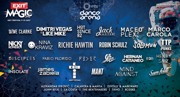Exit festival održat će se ove godine od 7. do 10. srpnja na Petrovaradinskoj tvrđavi, a zatim Exit Avantura putuje na Jadransko more zbog trećeg Sea Dance festivala od 14. do 16. srpnja. Nastupe su već potvrdili The Prodigy, Skrillex, Ellie Goulding, David Guetta, Wiz Khalifa, Hurts, George Clinton & Parliament Funkadelic, Bastille, Stereo MCs, The Vaccines, Richie Hawtin, Jeff Mills, Dimitri Vegas & Like Mike, Stormzy, Robin Schulz, Lost Frequencies, Solomun, Marco Carola, Sister Bliss – Faithless DJ Set, Andy C, Maceo Plex, Black Coffee, Banco de Gaia, Cock Sparrer, Paradise Lost, klubovi Nitsa, Tresor, Concrete i Grelle Forelle te brojni drugi.