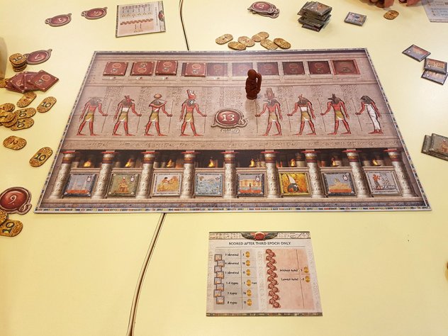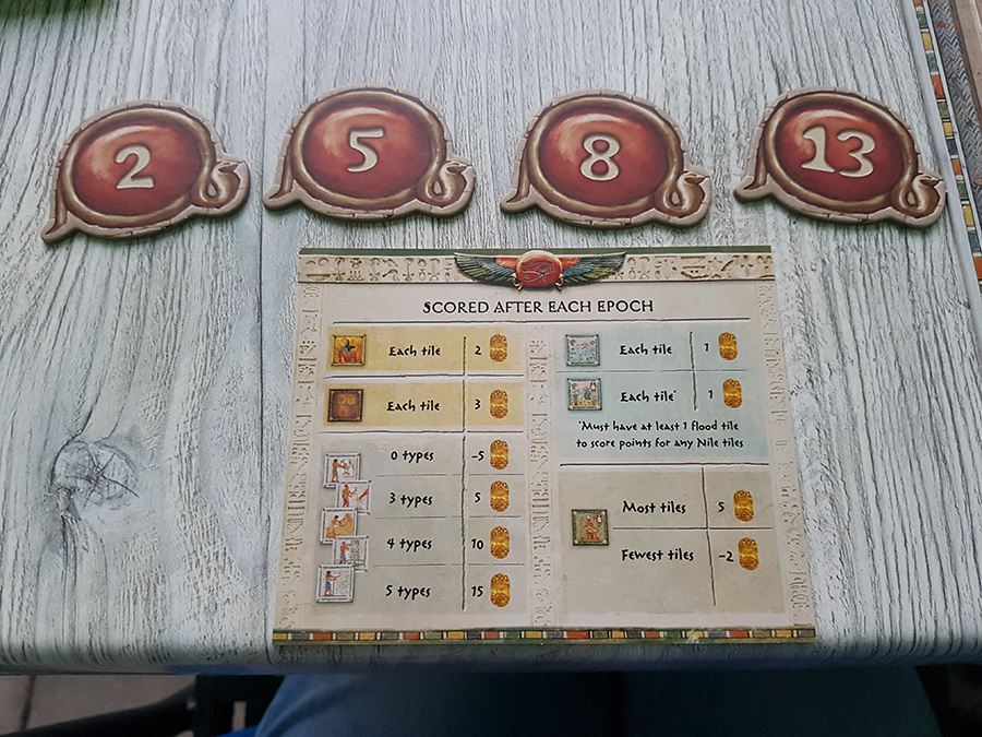 Iako je (uz iznimku prirodnih katastrofa) ponuda šarolika, primamljiva i obećava sigurnu naklonost vrhovnog božanstva, treba stati na loptu i usredotočiti se na određeni način skupljanja bodova. Skupiti po malo od svega nije dobar način da vas netko primijeti. (Osobno, nikad ne bih pogledala tipa koji ima dvije različite zgrade, poplavu, zemljište i civilizaciju. No, pet istih zgrada, to je već druga stvar.) Na kraju svake epohe igrači dobivaju bodove za sva zemljišta koja posjeduju, no samo ako su uspješno navodnjena. Različite civilizacije koje su pokorili također donose bodove. Igrač koji je poput Varysa ili Grime Wormtonguea šaputao na uha najviše faraona osvaja pet bodova, a onaj koji je u političkim igrama obnašao ulogu fikusa kažnjava se oduzimanjem dva boda. Čak je i Ra svjestan da bez dobre veze sve pada u vodu. Na kraju treće epohe u računicu ulaze i sve piramide, sfinge, hramovi i ostala čuda arhitekture koja ste uspjeli uvrstiti u svoju zbirku.