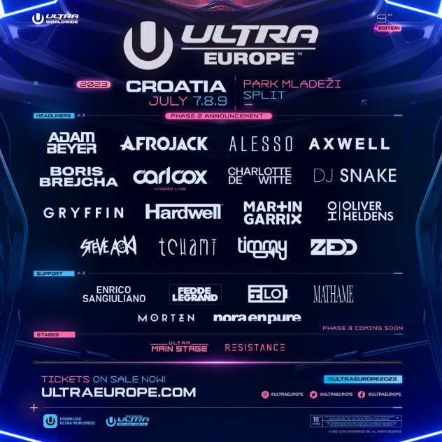 Krenulo je završno odbrojavanje do najveće party groznice u Hrvatskoj! Festival ULTRA Europe po deveti se put vraća u samo srce Dalmacije, od 7. do 9. srpnja 2023. godine, a zvjezdani status ove svjetske festivalske meke dodatno će potvrditi 14 novih objavljenih imena izvođača koji stižu u Split. Ultranaute ponovno očekuje ljeto iz snova, a njih više od 150.000 plesat se uz ritmove velikana elektroničke scene – na glavnu splitsku te RESISTANCE pozornicu stižu Alesso, Axwell, DJ Snake, Gryffin, Oliver Heldens, Steve Aoki, Tchami i Zedd, a pridružuju im se i Enrico Sangiuliano, Fedde Legrand, HI-LO, Mathame, Morten i Nora En Pure.