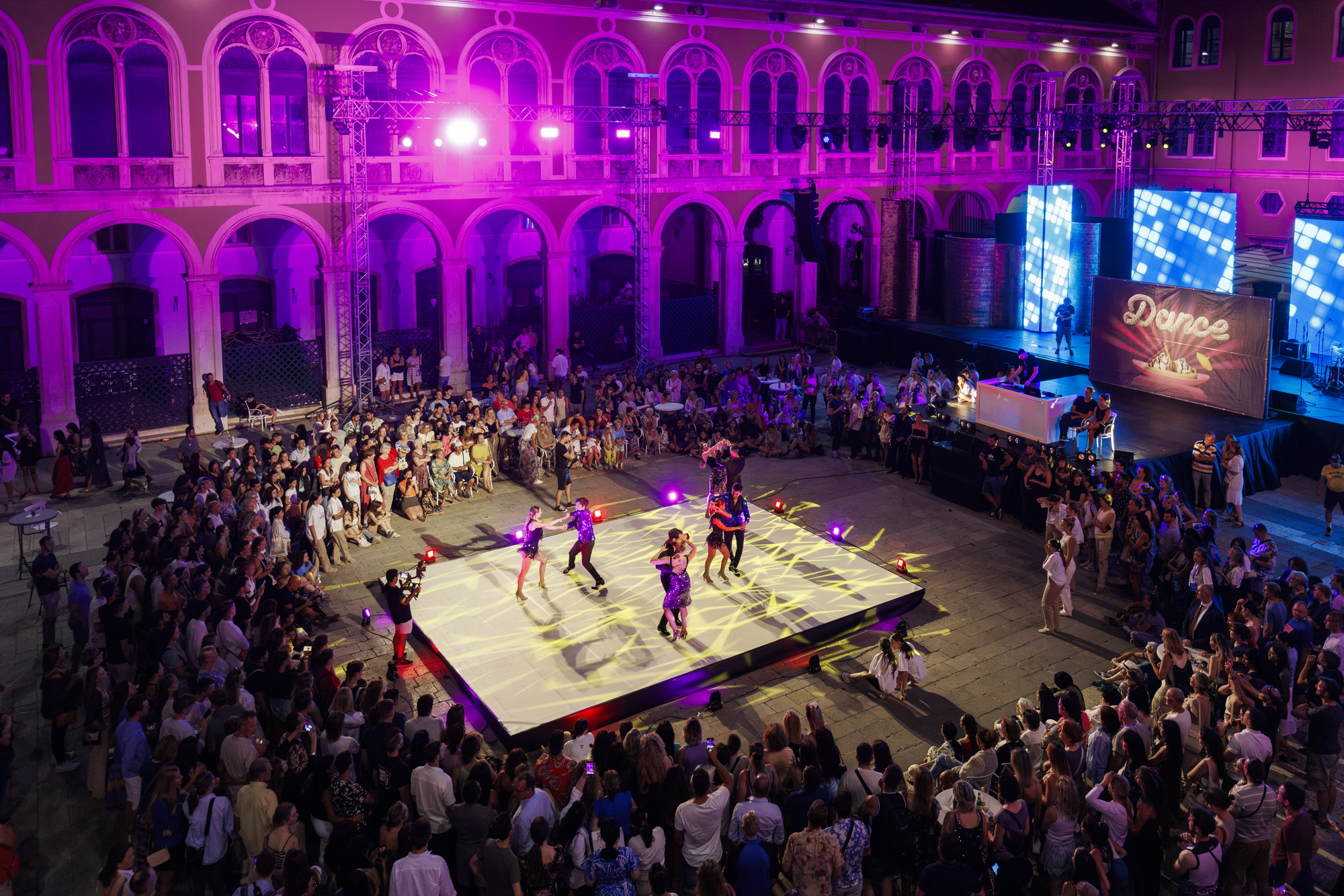 Split, 25. lipnja 2023. – Najljepša i najpoznatija splitska pozornica na otvorenom, Prokurative, sinoć je bila ispunjena svima koji su htjeli podijeliti svoju ljubav prema plesu i pridružiti se vrsnim splitskim plesačima i umjetnicima na večeri „Prokurative plešu“. Čak sedam sjajnih splitskih plesnih klubova, redatelj večeri Ivan Leo Lemo, koreograf Alen Sesartić, DJ Garson, Zvonimir Dusper Dus, voditelji Manuela Svorcan i Denis Tomić… svi su oni ujedinili svoj plesni i umjetnički izričaj, kako bi na Splitskom festivalu stvorili jednu posebnu večer, prepunu izvrsne glazbe, energije, ritma i emocija. Ni Splićani i njihovi gosti nisu odoljeli pa su se i sami uključili i zaplesali na Prokurativama.