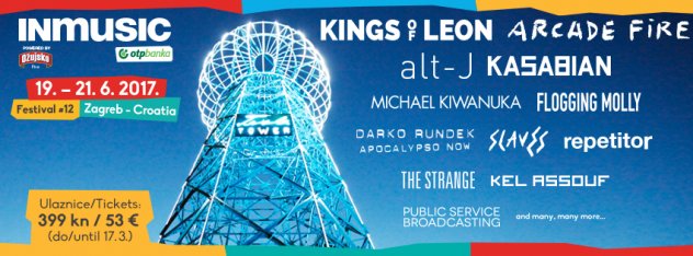 INmusic festival #12 održati će se od 19. do 21. lipnja 2017. godine na zagrebačkom Jarunu uz potporu Ožujskog piva kao powered by sponzora te OTP banke koja na festivalu omogućava beskontaktno plaćanje, a na festivalu će nastupiti neka od najatraktivnijih svjetskih glazbenih imena današnjice – Kings of Leon, Arcade Fire, Alt-J, Kasabian, Michael Kiwanuka, Flogging Molly, Darko Rundek, Slaves, Repetitor, The Strange, Kel Assouf, Public Service Broadcasting i mnogi drugi.