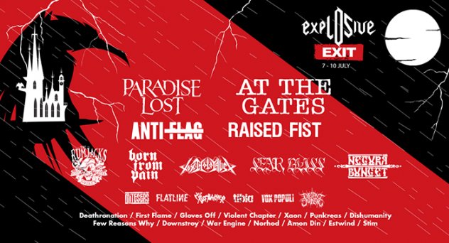 Tvorci slavn metal scene iz Goeteburgha, švedski sastav At The Gates predvodit će program završne večeri EXIT festivala, a njima će se pridružiti i fenomen svjetske metal/punk scene, Toxic Holocaust! Najžešći provod osigurat će i rumunska koncertna atrakcija Negura Bunget, koji će kombinacijom drevnih instrumenata s black metal zvukom uputpuniti monumentalan ambijent Explosive pozornice. Posebno zadovoljstvo da nastupe pred fanovima najžešćeg stagea Exita, imat će jedan od najcjenjenijih speed thrash metal sastava stare Jugoslavije, slovenski Bombarder. Iz Slovenije stiže i heavy metal bend Estwind, dok će istu večer nastupiti i heavy talijanska simfonijska metal atrakcija Norhod! Na tvrđavu stiže slavni death metal bend, Amon Din, kao i jedan od najperspektivnijih mladih bendova na domaćoj sceni, War Engine.