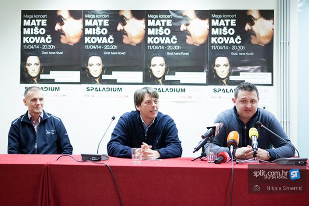 Na press konferenciji povodom koncerta Mate Miše Kovača u Spaladium Areni, nazočili su organizator Florijan Kordić, PR Spaladiuma Renco Posinković, te novi direktor Arene Damir Vidošević.