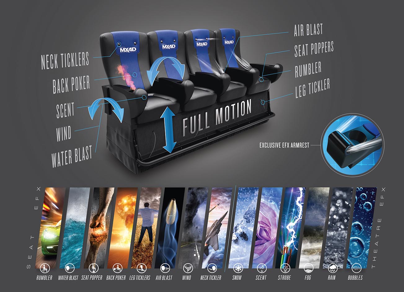 Jedna od najuzbudljivijih varijanti 4D-a koje nam filmska industrija donosi je američka tehnologija MX4D. Ona gledatelja stavlja u potpuno realističan doživljaj okoliša, gdje ga ugrađeni simulatori pokreta u kino sjedalu i čak 14 specijalnih efekta sinkroniziraju s akcijskim filmom na ekranu, što dovodi do toga da se film osjeća i gleda cijelim tijelom, a ne samo osjetom vida. Tehnološki sofisticirana, pomična sjedala opremljena su pulsarima koji „tickle“ efektom stvaraju realni dojam kretanja, dok dodatni uređaji poput simulatora vjetra, kiše, magle, svjetla ili dima gledatelju pružaju do sad neviđeni prikaz kino čarolije.