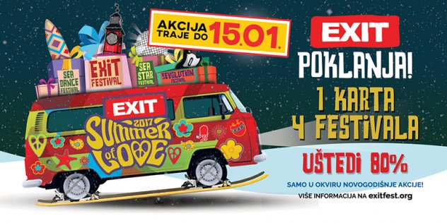 Samo do 15. siječnja traje najveća praznična akcija otkako postoji EXIT. Samo do tada, svi kupci ulaznica za EXIT, dobit će na poklon ulaznice za preostala tri festivala EXIT Ljeta ljubavi 2017, Sea Dance na predivnoj plaži Jaz u Crnoj Gori, proglašenoj od strane Lonely Planet za najbolju plažu Europe, Sea Star u atraktivnom turističkom kompleksu Stella Marris u Umagu i Revolution festival u Temišvaru u Rumunjskoj. EXIT ulaznice po cijeni od 439 kn mogu se kupiti na prodajnim mjestima ticketshop.hr. U prodaji je i veoma ograničen broj turističkih paketa za EXIT festival već od 69€. Paketi sadrže ulaznice i smještaj u festivalskom kampu na Dunavu, a na stranici Exit Tripa, službene turističke agencije EXIT Ljeta ljubavi, moguće je odabrati i drugi smještaj, u hotelima, hostelima ili apartmanima. U ponudi je i veoma ograničen broj paketa za Sea Star i Sea Dance festivale, po cijeni već od 49€ u koje ulaze noćenja u kampu festivala, kao i ulaznica, a u ponudi je i smještaj u apartmanima u okviru Sea Star festivalskog kompleksa već od 9.99€ za noć po osobi. Više informacija na www.exittrip.org.