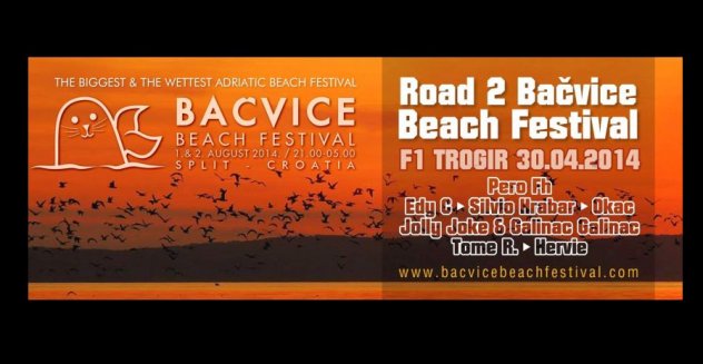 Prvi promotivni party Bačvice Beach festivala pod nazivom Road 2 Bačvice Beach Festival dogoditi će se u srijedu 30.4. u trogirskom klubu F1. Među glavnim gostima ističu se domaće snage Pero FH, Edy C, Silvio Hrabar, Okac, Jolly Joke, & Galinac Galinac, Tome R.